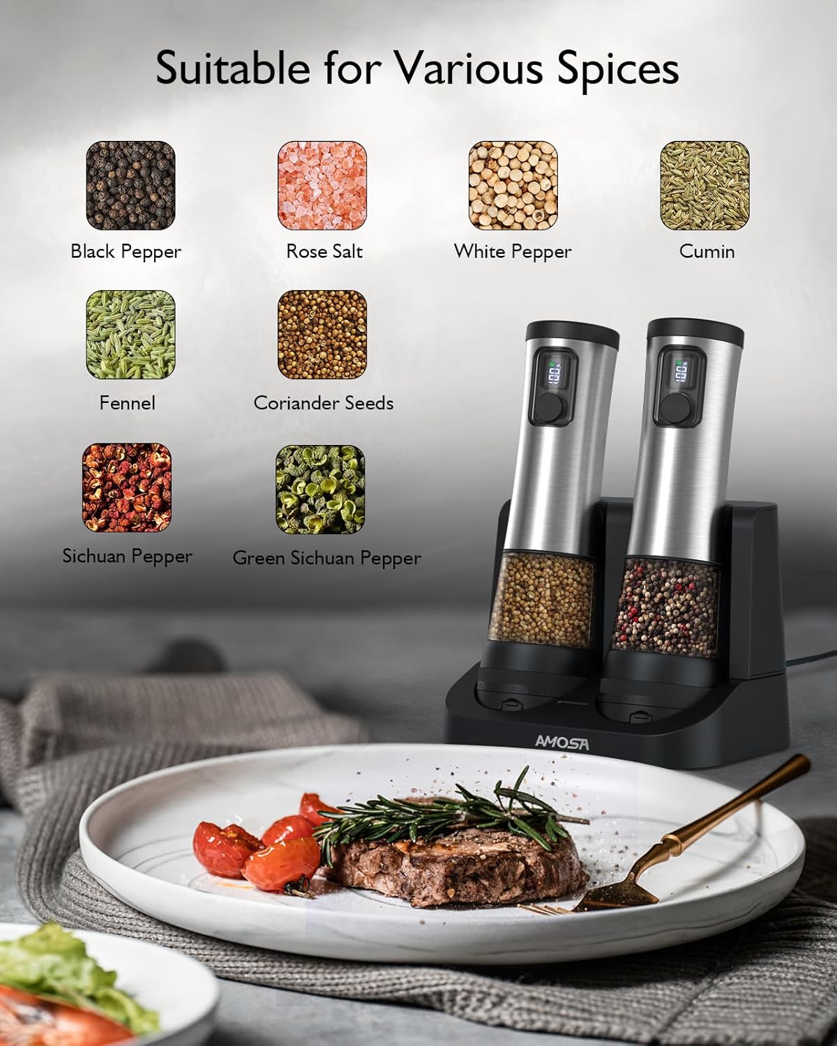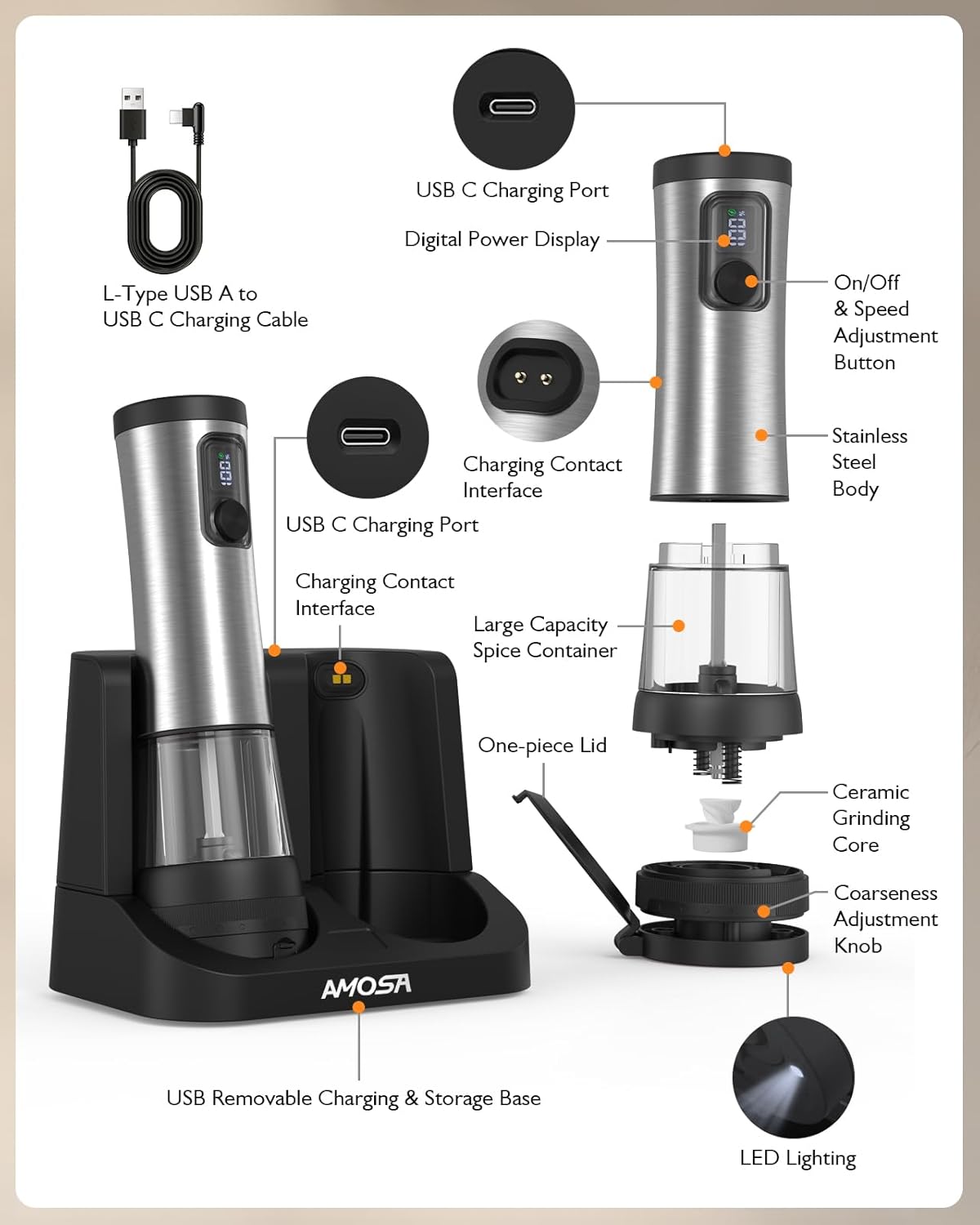 | Included Components | Electric Salt & Pepper Grinder * 2, Funnel * 1 & Cleaning Brush * 1, L-Type USB Charging Cable * 1, USB Charging & Storage Base * 1, User Manual * 1 |