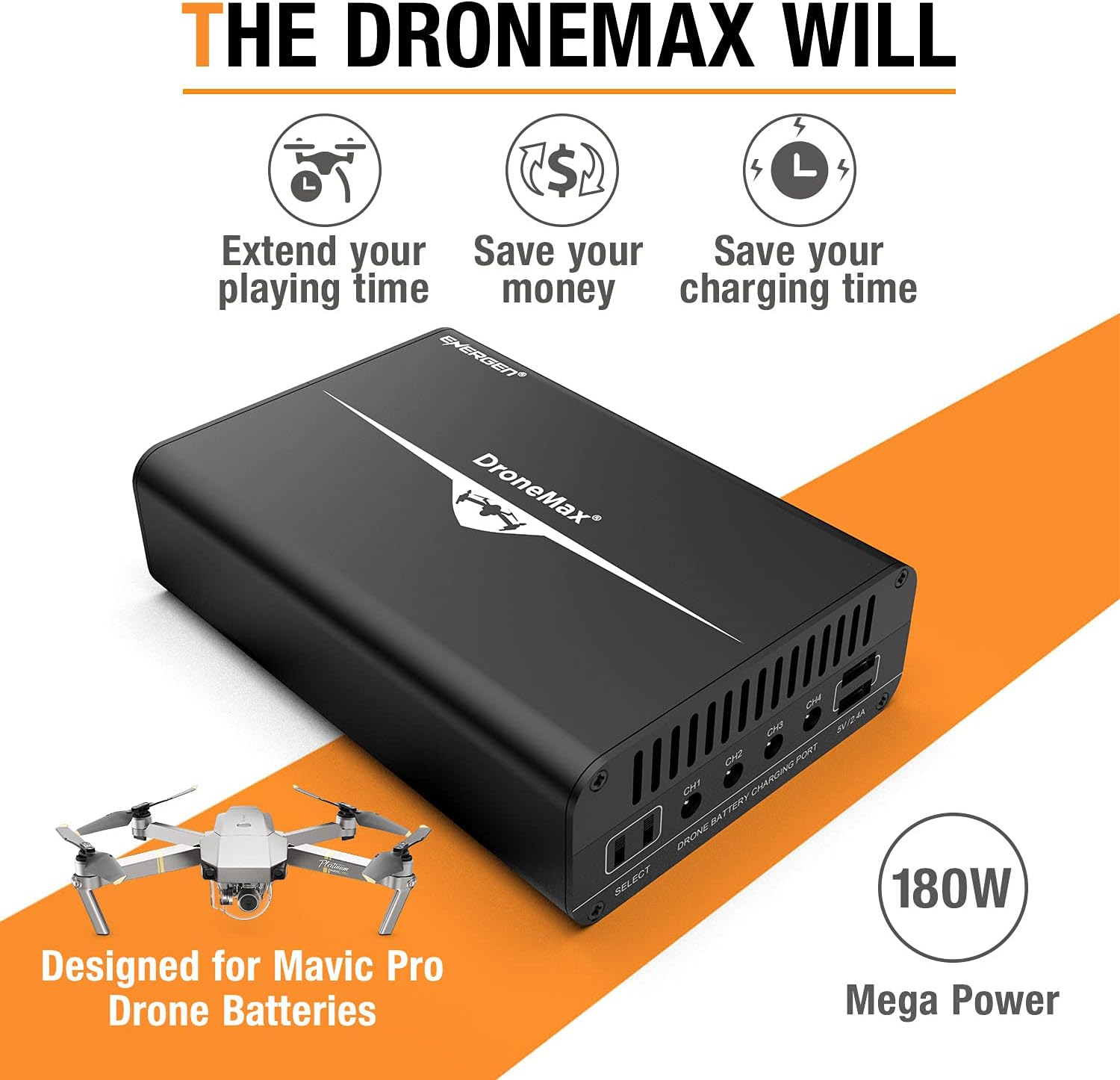 We are committed to providing safe and reliable power products that can be used to charge drone battery, whenever you need it. Our advantages of Drone Battery Charger: Energen drone battery chargers are intelligently designed to charge up to 4 batteries simultaneously with built-in overcharge protection and automated cooling control system. The upgraded Energen multiple drone battery charger only needs to purchase another battery charging cable to compatible with DJI Phantom 4 / Mavic Pro / Mavic 2 Pro / Mavic Air / Mavic Air 2 drone batteries (*Mavic Pro charging cable included)Energen Drone battery chargers also come equipped with 2 USB charging ports charging your smartphones, tablets and other USB devices. Aluminum enclosure provides excellent heat dissipation. It protects the internal circuitry from outside elements. It is fire resistant, non-conductive (anodization is non-conductive). Easy to use, spend 2 minutes to read our user manual to master the method of use.