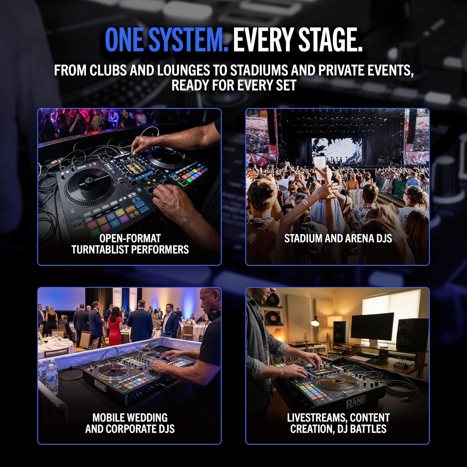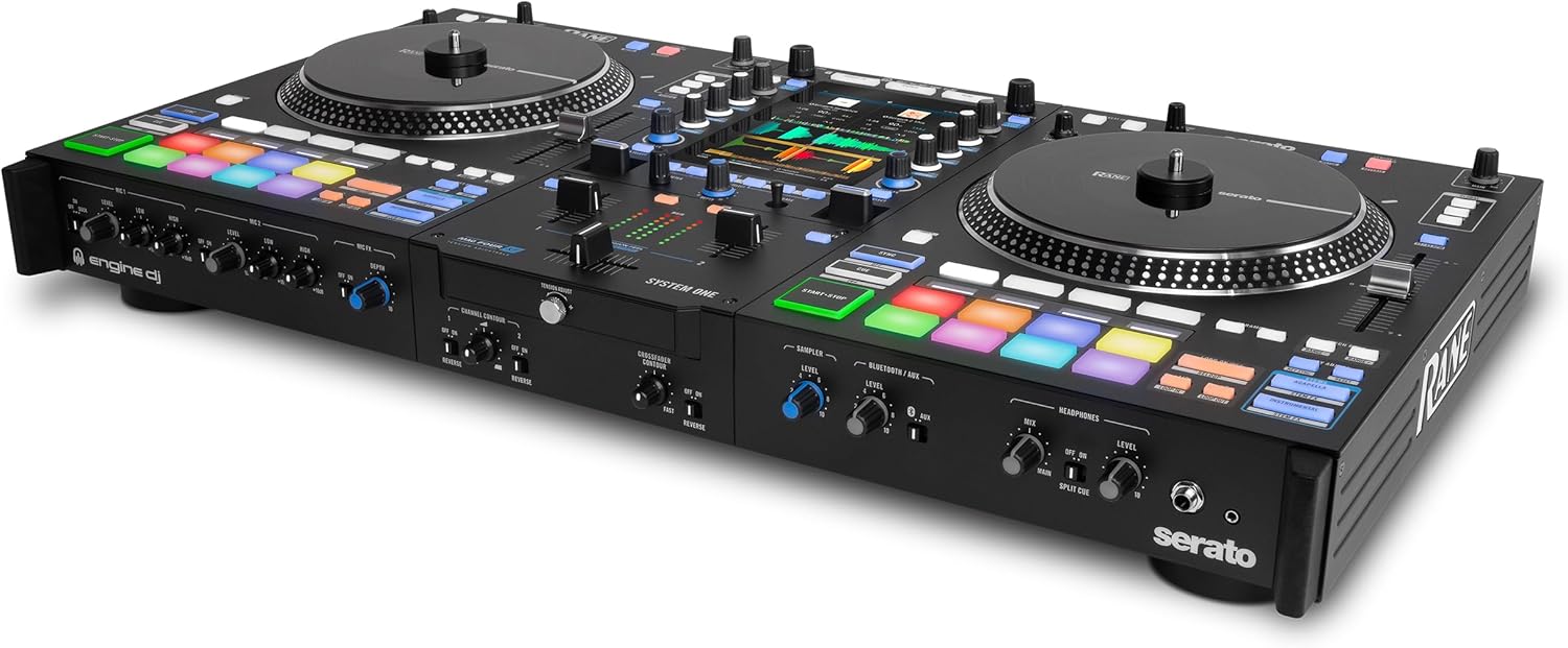 The first RANE product with Engine DJ on board, SYSTEM ONE allows open-format DJs to experience the trusted performance of RANE hardware while seamlessly mixing between standalone media, music streaming services, and software sources like Serato DJ Pro, with Algoriddim djay support coming in early 2026.RANE SYSTEM ONE is the only standalone DJ system with motorized platters and full Serato DJ Pro integration. Equipped with 7.2-inch aluminum motorized platters and the embedded Engine DJ operating system, this revolutionary system empowers open-format DJs to mix seamlessly between USB drives, SD cards, internal storage (sold separately), streaming services, and Serato DJ Pro without stopping playback. With touchscreen crate browsing, BPM and key sorting, OmniSource deck playback, and full access to Serato Stems and Scratch Bank, SYSTEM ONE delivers uncompromised performance. The 7-inch HD vertical touchscreen displays RGB waveforms and provides intuitive control over your entire performance. Unleash your creativity with standalone Stems capabilities, over 25 onboard Main FX, Sweep FX, Touch FX, and Fader FX. Eight performance pads per deck feature dynamic RGB lighting and OLED displays for instant visual feedback.